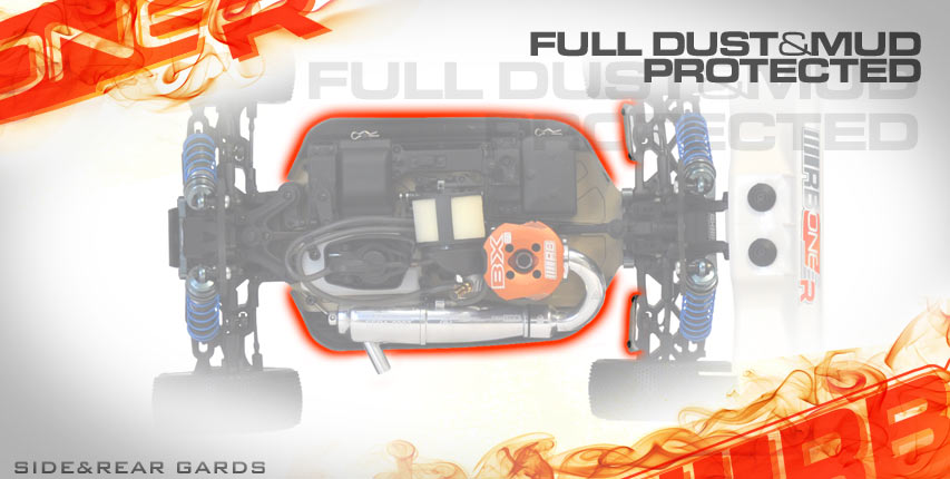 Other items includes is a switch with rubber cover, carbon and aluminium clutch shoes, 0.9, 1.0 and 1.1mm clutch springs, centre CVD rubber dust protection, rubber shock covers, mud flaps and dust protection for the rear, chrome and fluorescent stickers, shock and differential silicone oil, silicone tubing and clips.