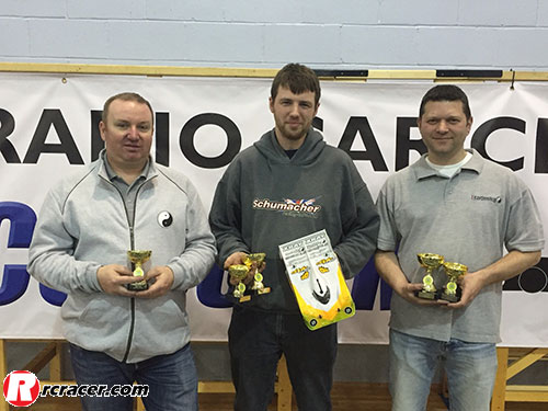 In the A final, Olly got away cleanly but a mistake by David at turn two allowed Mark to slip through into second place. Further incidents on the first lap dropped David down the field while the lead pair broke away at the front. After a couple of minutes Olly had built up a small margin and looked to be controlling the race, but in the middle part of the race Mark was able to close the gap to less than a second and with two minutes to go it looked like being a fight to the line. Tricky negotiation of back markers cost Mark a little time though and he was left with a gap of two seconds to try and close in the final handful of laps. He managed to catch Olly as they started the final lap, but was unable to find a way past in the remaining corners. The pace of the leading two cars was such that they lapped the entire field but were only separated by 0.07 of a second at the finish! David Spashett recovered to take a hard fought third following a tough race.